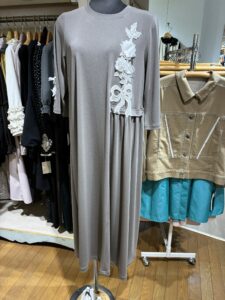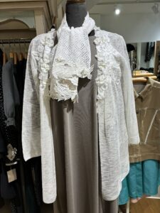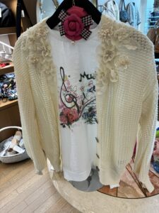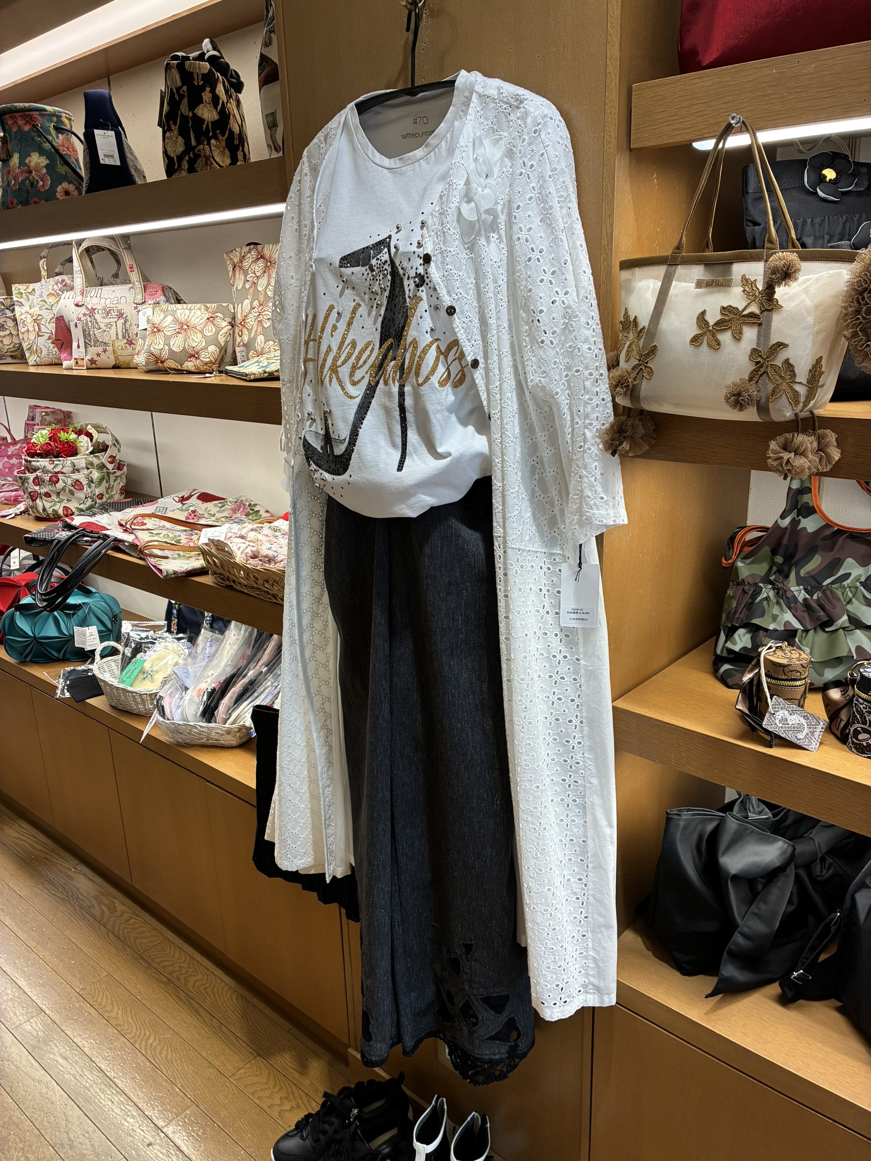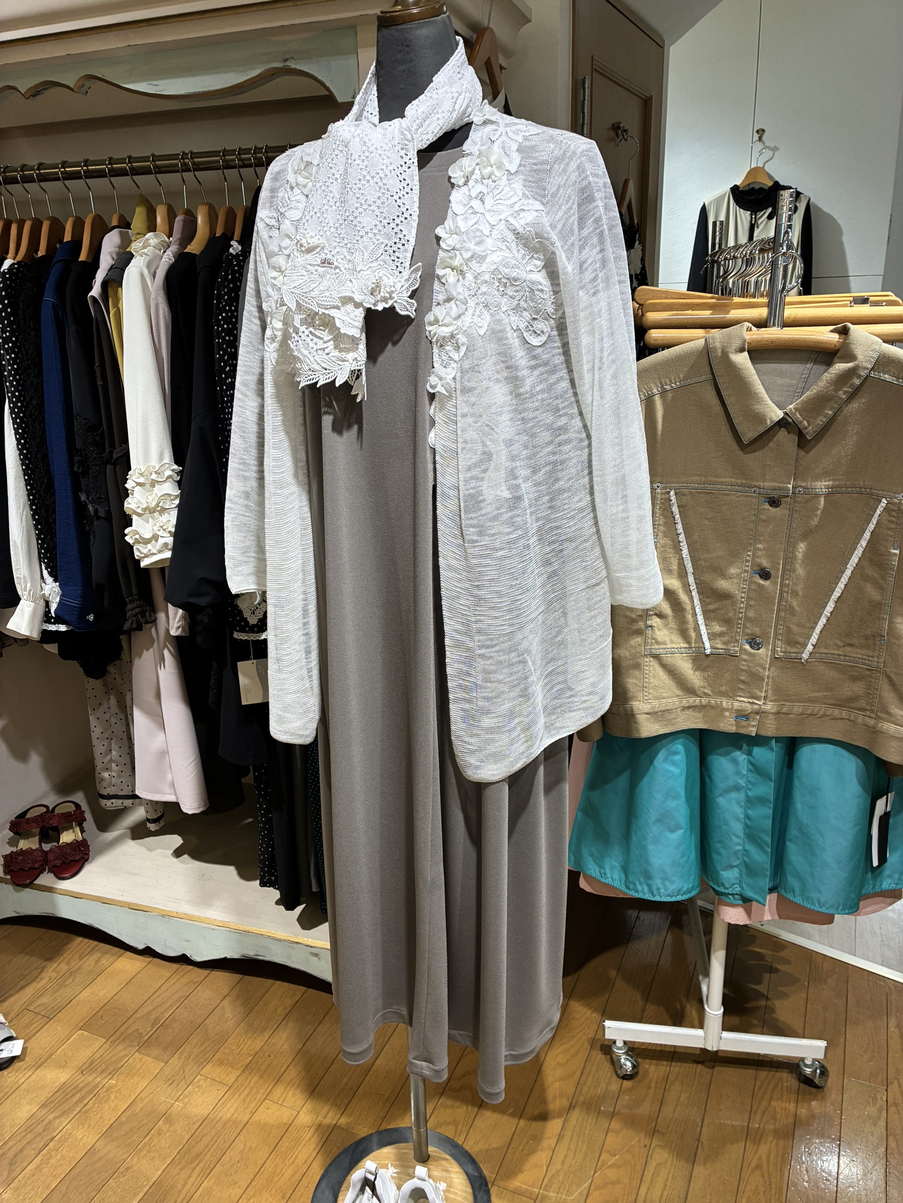 季節の変わり目に重宝する、軽やかなメッシュ編みのカーディガンも「アミティエ」の定番スタイルの一つです。