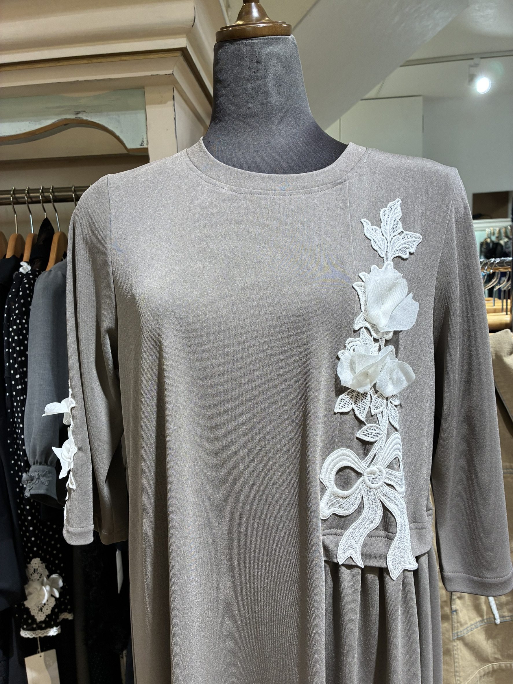 ゆったりとしたシルエットは体のラインを優しくカバーしつつ、動くたびに揺れる軽やかなドレープ感が女性らしさを引き立てます。