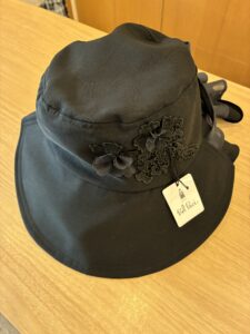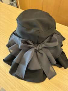 大きなリボンとティアード状のフリルが特徴的な「つば広ハット」で、お顔から襟足までしっかり日差しをガードできるデザインのようです。