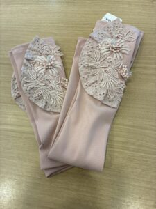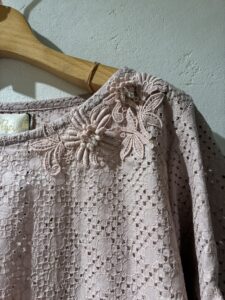 繊細なレース素材が全体に施されており、ほんのり透け感が軽やかさと女性らしさを演出します。首元には立体的なお花モチーフの装飾があしらわれ、シンプルながらも華やかなアクセントに。顔まわりをぱっと明るく見せてくれます。