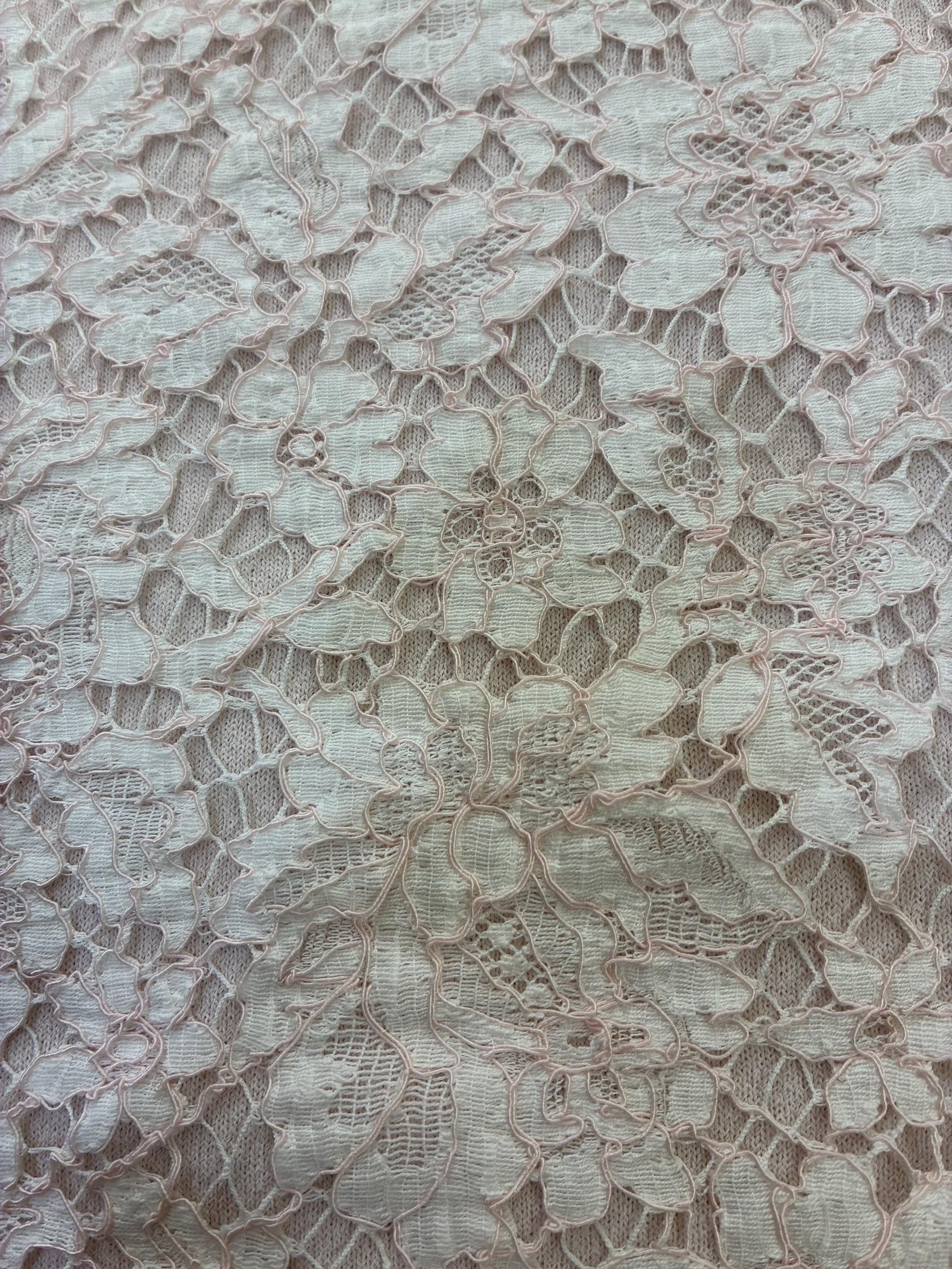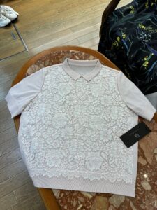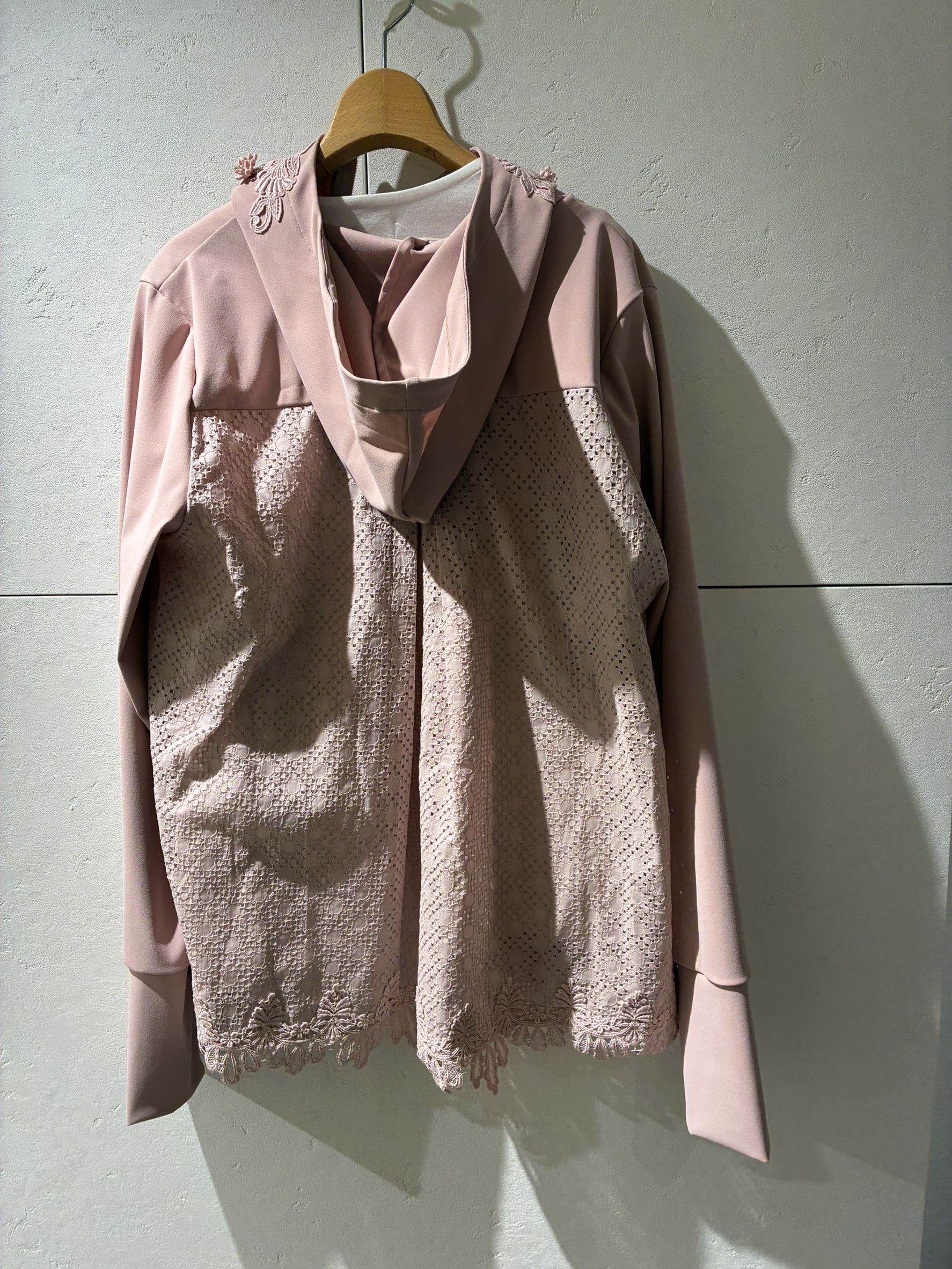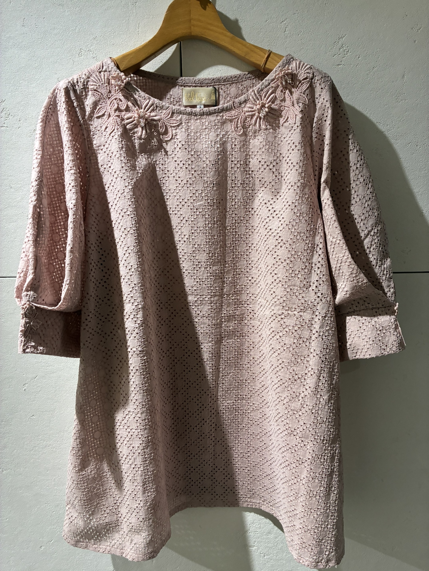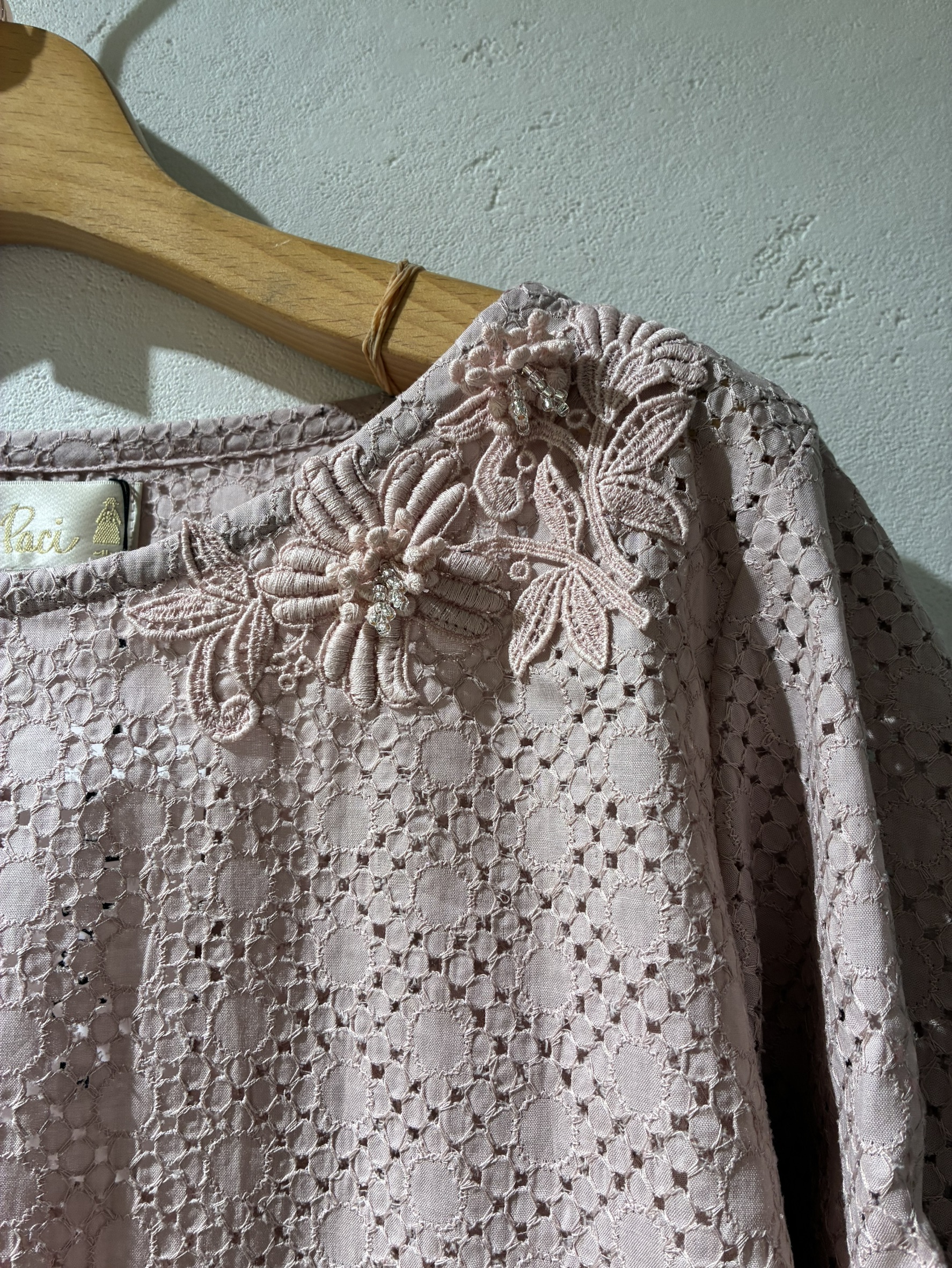 フロント全体に繊細なフラワーレースを贅沢にあしらい、華やかで女性らしい印象に。ベースのやわらかなピンクカラーが、優しく肌なじみの良い一枚です。襟付きデザインできちんと感もあり、カジュアルになりすぎず上品に着こなせます。